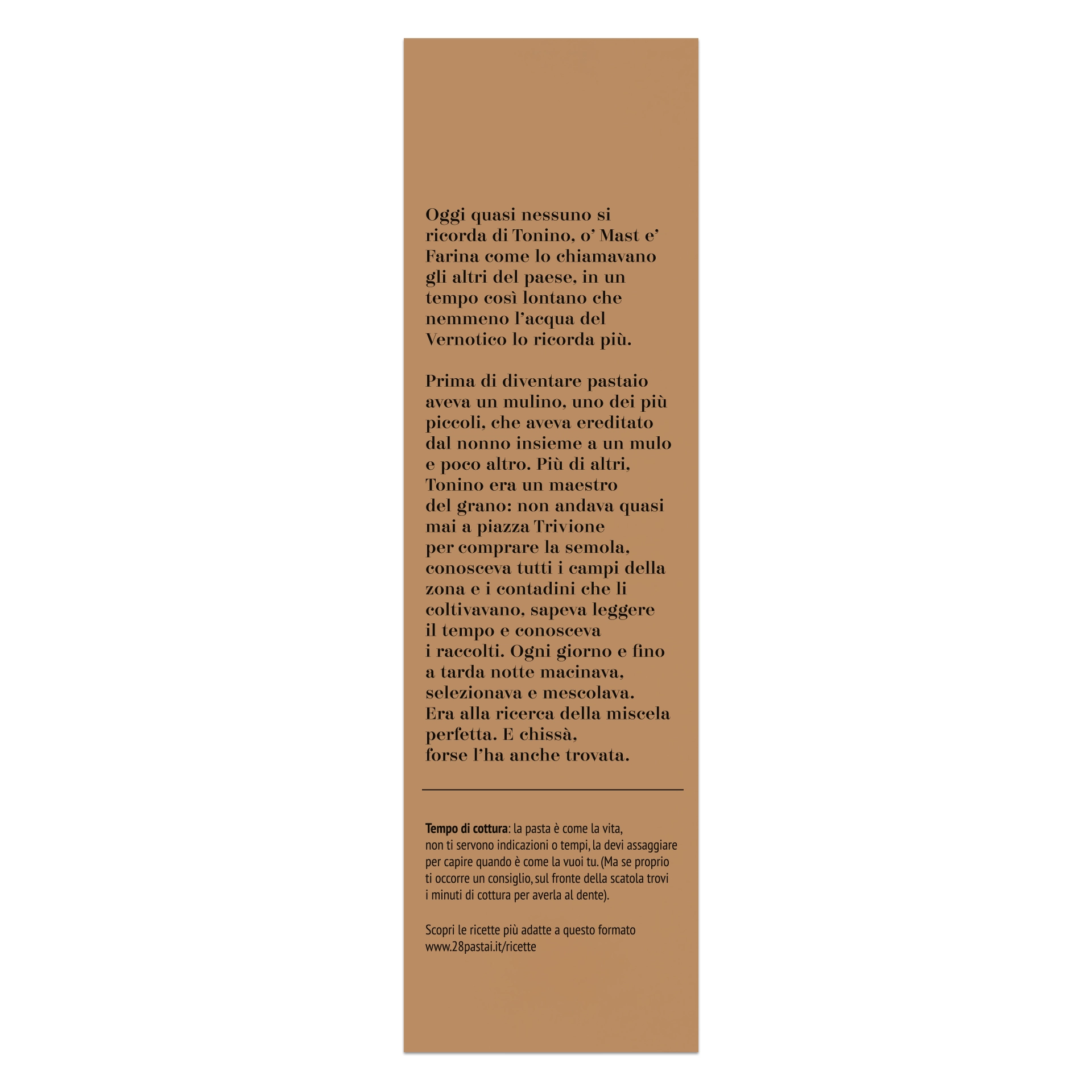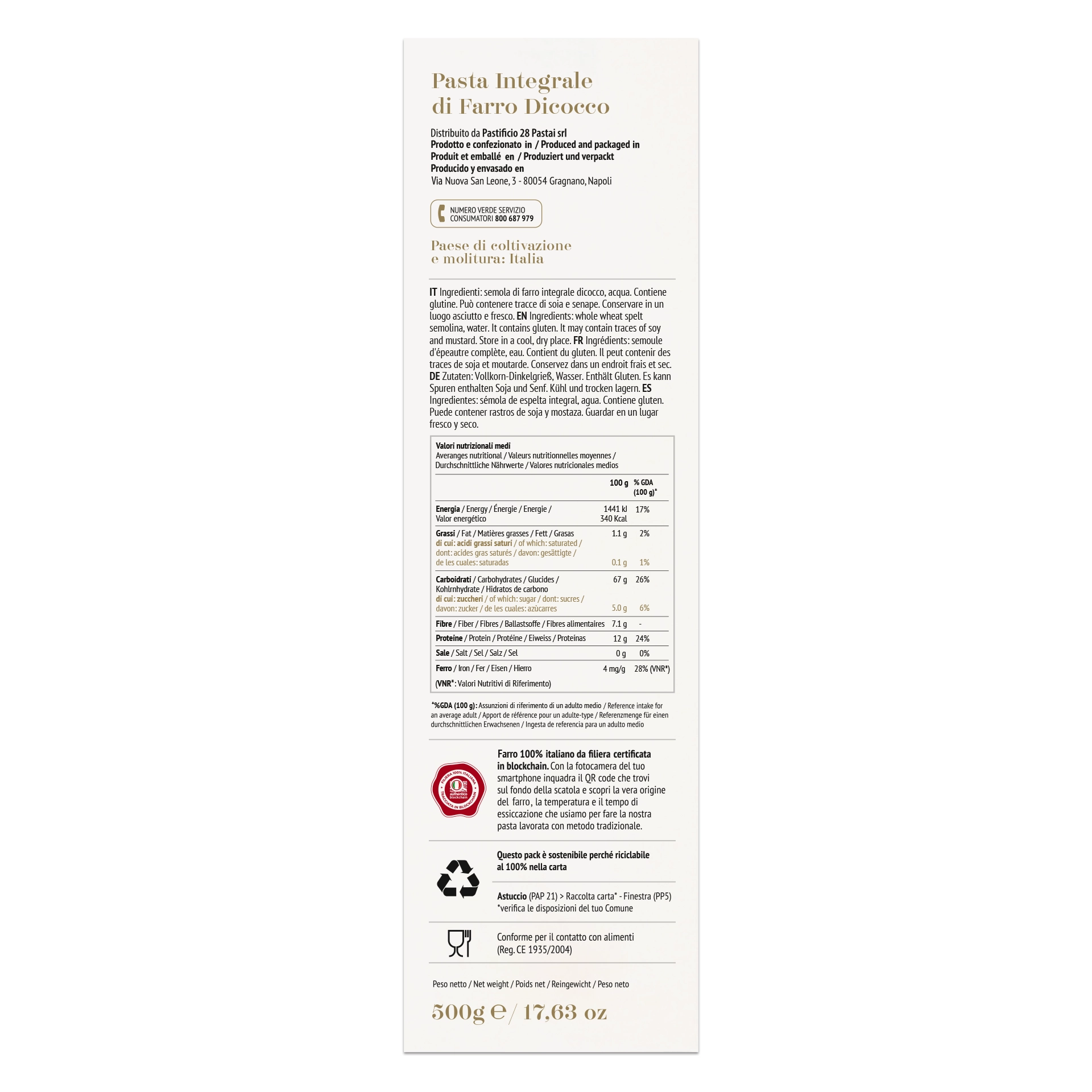 Spaghetti is een soort lange volkoren pasta van Gragnano, geproduceerd door 28 pastamakers in zijn historische pastafabriek in Gragnano, met een ambachtelijk recept waarbij uitsluitend 100% Italiaanse tarwe uit de Frentane heuvels wordt gebruikt.
